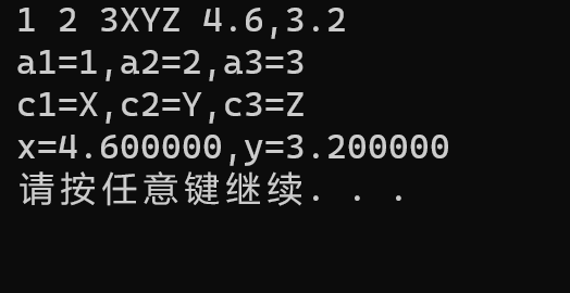 1 #include<stdio.h> 2 int main() 3 { 4 double x,y; 5 char c1,c2,c3; 6 int a1,a2,a3; 7 8 scanf("%d %d %d",&a1,&a2,&a3); 9 printf("a1=%d,a2=%d,a3=%d\n",a1,a2,a3); 10 11 scanf("%c%c%c",&c1,&c2,&c3); 12 printf("c1=%c,c2=%c,c3=%c\n",c1,c2,c3); 13 14 scanf("%lf,%lf",&x,&y); 15 printf("x=%lf,y=%lf\n",x,y); 16 17 return 0; 18 }
