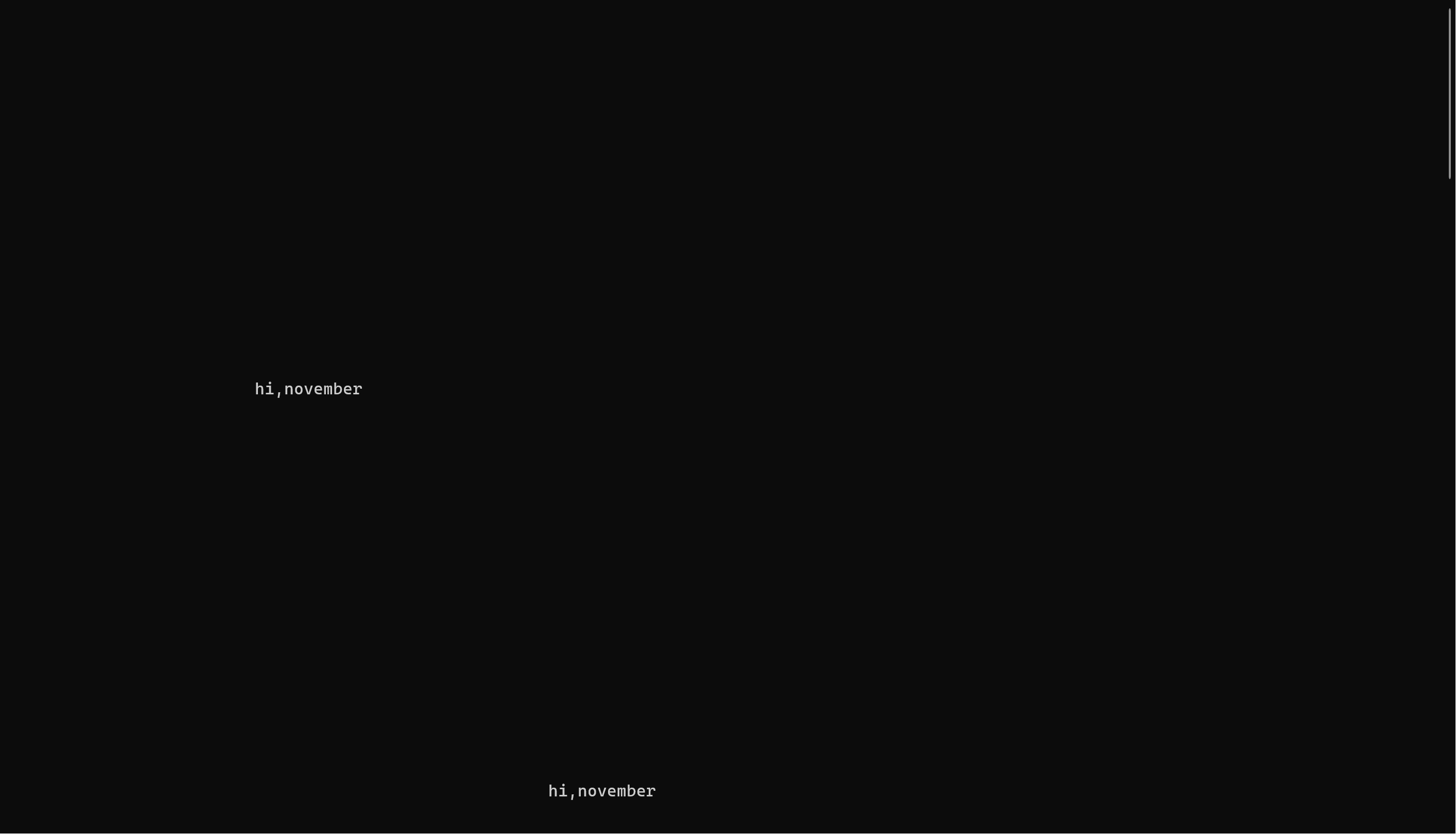 1 #include<stdio.h> 2 #include<stdlib.h> 3 #include<time.h> 4 #include<windows.h> 5 #define N 80 6 7 void print_text(int line,int col,char text[]); 8 void print_spaces(int n); 9 void print_blank_lines(int n); 10 11 int main(){ 12 int line,col,i; 13 char text[N]="hi,november"; 14 15 srand(time(0)); 16 for(i=1;i<=10;++i) 17 { 18 line=rand()%25; 19 col= rand() % 80; 20 print_text(line, col, text); 21 Sleep(1000); 22 } 23 return 0; 24 } 25 void print_spaces(int n) { 26 int i; 27 for(i = 1; i <= n; ++i) 28 printf(" "); 29 } 30 void print_blank_lines(int n) { 31 int i; 32 33 for(i = 1; i <= n; ++i) 34 printf("\n"); 35 } 36 void print_text(int line, int col, char text[]) { 37 print_blank_lines(line-1); 38 print_spaces(col-1); 39 printf("%s", text); 40 }