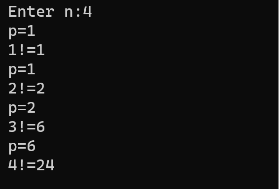 1 #include<stdio.h> 2 long long fac(int n); 3 4 int main() 5 { 6 int i,n; 7 8 printf("Enter n:"); 9 scanf("%d",&n); 10 for(i=1;i<=n;++i) 11 printf("%d!=%lld\n",i,fac(i)); 12 13 return 0; 14 } 15 long long fac(int n){ 16 static long long p=1; 17 printf("p=%lld\n",p); 18 p=p*n; 19 return p; 20 }
