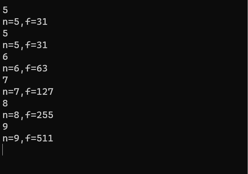 1 #include<stdio.h> 2 long long func(int n); 3 4 int main(){ 5 int n; 6 long long f; 7 8 while(scanf("%d",&n)!=EOF) 9 { 10 f=func(n); 11 printf("n=%d,f=%lld\n",n,f); 12 } 13 return 0; 14 } 15 16 long long func(int n){ 17 if(n==1) 18 return 1; 19 else 20 return 2*func(n-1)+1; 21 }