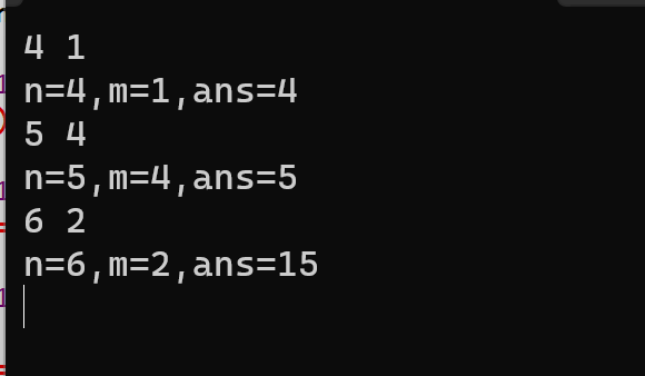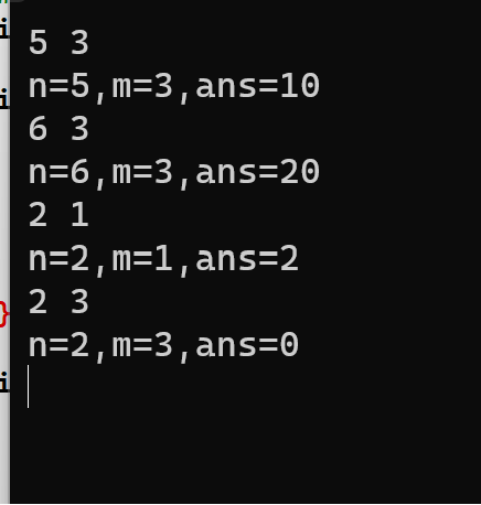 1 #include<stdio.h> 2 int func(int n,int m); 3 4 int main() 5 { 6 int n,m; 7 while(scanf("%d %d",&n,&m)!=EOF) 8 printf("n=%d,m=%d,ans=%d\n",n,m,func(n,m)); 9 10 return 0; 11 } 12 13 int func(int n,int m) { 14 15 int a=1,b=1,c=1,i=1; 16 if(n>m){ 17 18 for(i=1;i<=n;++i) { 19 a*=i; 20 } 21 for(i=1;i<=m;++i) 22 { 23 b*=i; 24 }for(i=1;i<=n-m;++i) 25 { 26 c*=i; 27 } 28 return a/(b*c); 29 } 30 31 32 if(n<m) 33 return 0; 34 35 if(n==m||m==0) 36 return 1; 37 38 }