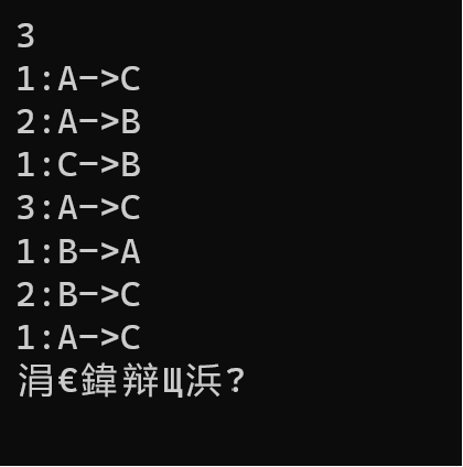 1 #include<stdio.h> 2 3 void hanoi(unsigned int n,char from,char temp,char to,int count); 4 void moveplate(unsigned int n,char from,char to); 5 6 int main(){ 7 unsigned int n; 8 int count=0; 9 while(scanf("%u",&n)!=EOF){ 10 hanoi(n,'A','B','C',count); 11 printf("cishu:",count); 12 } 13 return 0; 14 } 15 16 void hanoi(unsigned int n,char from,char temp,char to,int count){ 17 if(n==1){ 18 moveplate(n,from,to); 19 count++; 20 } 21 else 22 { 23 hanoi(n-1,from,to,temp,count); 24 count++; 25 moveplate(n,from,to); 26 hanoi(n-1,temp,from,to,count); 27 count++; 28 } 29 } 30 31 void moveplate(unsigned int n,char from,char to) 32 { 33 printf("%u:%c->%c\n",n,from,to);