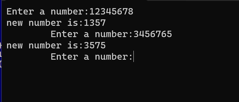 1 #include<stdio.h> 2 #include<math.h> 3 long func(long s); 4 5 int main(){ 6 long s,k; 7 8 printf("Enter a number:"); 9 while(scanf("%ld",&s)!=EOF){ 10 k=func(s); 11 printf("new number is:%ld\n\t",k); 12 printf("Enter a number:"); 13 14 } 15 return 0; 16 } 17 long func(long s) 18 { 19 int r=0; 20 int k=0; 21 while(s!=0){ 22 if(s%2==0) 23 { 24 s=s/10; 25 } 26 else 27 { 28 r=r*10+s%10; 29 s=s/10; 30 } 31 } 32 while(r!=0) 33 { 34 k=k*10+r%10; 35 r=r/10; 36 } 37 return k; 38 39 }