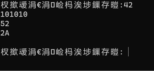 1 #include<stdio.h> 2 #define N 100 3 void dec_to_n(int x,int n); 4 5 int main(){ 6 int x; 7 8 printf("输入一个十进制整数:"); 9 while(scanf("%d",&x)!=EOF){ 10 dec_to_n(x,2); 11 dec_to_n(x,8); 12 dec_to_n(x,16); 13 14 printf("\n输入一个十进制整数: "); 15 16 } 17 return 0; 18 } 19 20 21 22 void dec_to_n(int x,int n){ 23 char ans[N]; 24 char map[17] = {"0123456789ABCDEF"}; 25 int r; 26 int cnt=0,i; 27 do{ 28 r=x%n; 29 ans[cnt++]=map[r]; 30 x=x/n; 31 } 32 while(x!=0); 33 for(i=cnt-1;i>=0;--i) 34 printf("%c",ans[i]); 35 36 printf("\n"); 37 }