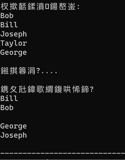 1 #include<stdio.h> 2 #include<string.h> 3 4 #define N 5 5 #define M 20 6 7 void output(char str[][M],int n); 8 void bubble_sort(char str[][M],int n); 9 10 int main(){ 11 char name[][M]={"Bob","Bill","Joseph","Taylor","George"}; 12 int i; 13 14 printf("输出初始名单:\n"); 15 output(name,N); 16 17 printf("\n排序中.....\n"); 18 bubble_sort(name,N); 19 20 printf("\n按字典输出名单:\n"); 21 output(name,N); 22 23 return 0; 24 } 25 26 void output(char str[][M],int n){ 27 int i; 28 29 for(i=0;i<n;i++) 30 printf("%s\n",str[i]); 31 } 32 33 void bubble_sort(char str[][M],int n){ 34 int i,j; 35 char x[M]; 36 for(i=0;i<n;i++){ 37 for(j=i;j<n;j++){ 38 if(strcmp(str[j],str[j+1])>0) 39 { 40 strcpy(x,str[j]); 41 strcpy(str[j],str[j+1]); 42 strcpy(str[j+1],x); 43 } 44 } 45 } 46 }