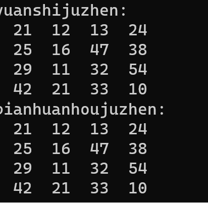 1 #include<stdio.h> 2 #define N 100 3 #define M 4 4 void output(int x[][N],int n); 5 void rotate_to_right(int x[][N],int n); 6 7 int main(){ 8 int t[][N]={{21,12,13,24}, 9 {25,16,47,38}, 10 {29,11,32,54}, 11 {42,21,33,10}}; 12 13 printf("yuanshijuzhen:\n"); 14 output(t,M); 15 16 printf("bianhuanhoujuzhen:\n"); 17 output(t,M); 18 19 return 0; 20 } 21 22 void output(int x[][N],int n){ 23 int i,j; 24 25 for(i=0;i<n;i++){ 26 for(j=0;j<n;j++) 27 printf("%4d",x[i][j]); 28 29 printf("\n"); 30 } 31 } 32 33 void rotate_to_right(int x[][N],int n){ 34 int i,j,a; 35 36 for(i=0;i<M;i++) 37 { 38 a=x[i][M-1]; 39 } 40 41 for(j=M-1;j>=1;j--){ 42 x[i][j]=x[i][j-1];} 43 44 x[i][0]=a; 45 }