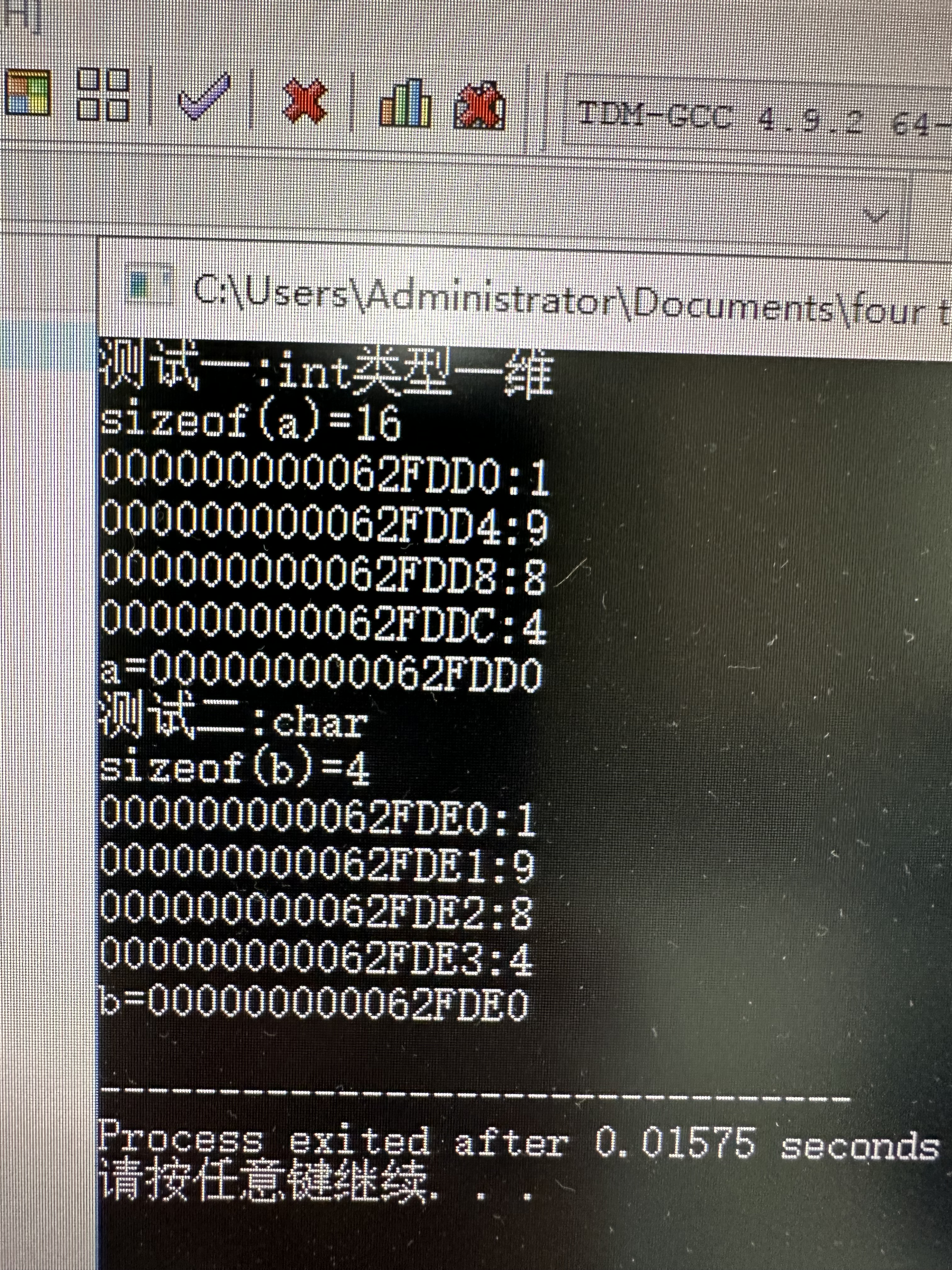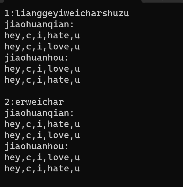 1 #include<stdio.h> 2 #include<string.h> 3 4 #define N 80 5 6 void swap_str(char s1[N],char s2[N]); 7 void test1(); 8 void test2(); 9 10 int main(){ 11 printf("1:lianggeyiweicharshuzu\n"); 12 test1(); 13 14 printf("\n2:erweichar\n"); 15 test2(); 16 17 return 0; 18 } 19 20 void test1(){ 21 char views1[N]="hey,c,i,hate,u"; 22 char views2[N]="hey,c,i,love,u"; 23 24 printf("jiaohuanqian:\n"); 25 puts(views1); 26 puts(views2); 27 28 swap_str(views1,views2); 29 30 printf("jiaohuanhou:\n"); 31 puts(views1); 32 puts(views2); 33 34 } 35 36 void test2(){ 37 char views[2][N]={"hey,c,i,hate,u", 38 "hey,c,i,love,u"}; 39 40 printf("jiaohuanqian:\n"); 41 puts(views[0]); 42 puts(views[1]); 43 44 swap_str(views[0],views[1]); 45 46 printf("jiaohuanhou:\n"); 47 puts(views[0]); 48 puts(views[1]); 49 50 51 } 52 53 void swap_str(char s1[N],char s2[N]){ 54 char tmp[N]; 55 56 strcpy(tmp,s1); 57 strcpy(s1,s2); 58 strcpy(s2,tmp); 59 }