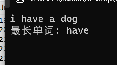 1 #include <stdio.h> 2 #define N 1000 3 4 int main() { 5 char line[N]; 6 int word_len; 7 int max_len; 8 int end; 9 int i; 10 11 while(gets(line) != NULL) { 12 word_len = 0; 13 max_len = 0; 14 end = 0; 15 16 i = 0; 17 while(1) { 18 19 while(line[i] == ' ') { 20 word_len = 0; 21 i++; 22 } 23 24 25 while(line[i] != '\0' && line[i] != ' ') { 26 word_len++; 27 i++; 28 } 29 30 31 if(max_len < word_len) { 32 max_len = word_len; 33 end = i; 34 } 35 36 if(line[i] == '\0') 37 break; 38 } 39 40 41 printf("最长单词: "); 42 for(i = end - max_len; i < end; ++i) 43 printf("%c", line[i]); 44 printf("\n\n"); 45 } 46 47 return 0; 48 }
