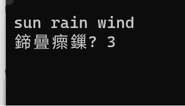 1 #include <stdio.h> 2 3 #define N 80 4 5 int count(char x[]); 6 7 int main() { 8 char words[N+1]; 9 int n; 10 11 while(gets(words) != NULL) { 12 n = count(words); 13 printf("单词数: %d\n\n", n); 14 } 15 16 return 0; 17 } 18 19 int count(char x[]) { 20 int i; 21 int word_flag = 0; 22 int number = 0; 23 24 for(i = 0; x[i] != '\0'; i++) { 25 if(x[i] == ' ') 26 word_flag = 0; 27 else if(word_flag == 0) { 28 word_flag = 1; 29 number++; 30 } 31 } 32 33 return number; 34 }