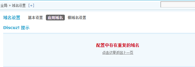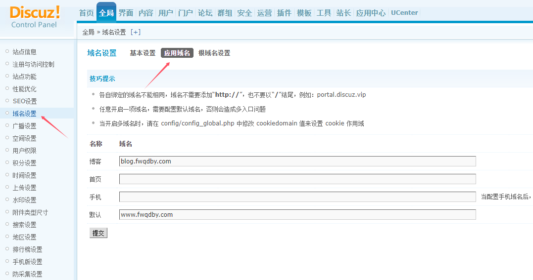 了解代码后就很清晰了,头部logo跳转链接是默认应用域名,我们如果是要修改对应的跳转链接,直接进入Discuz管理中心,依次点击全局——域名设置——应用域名