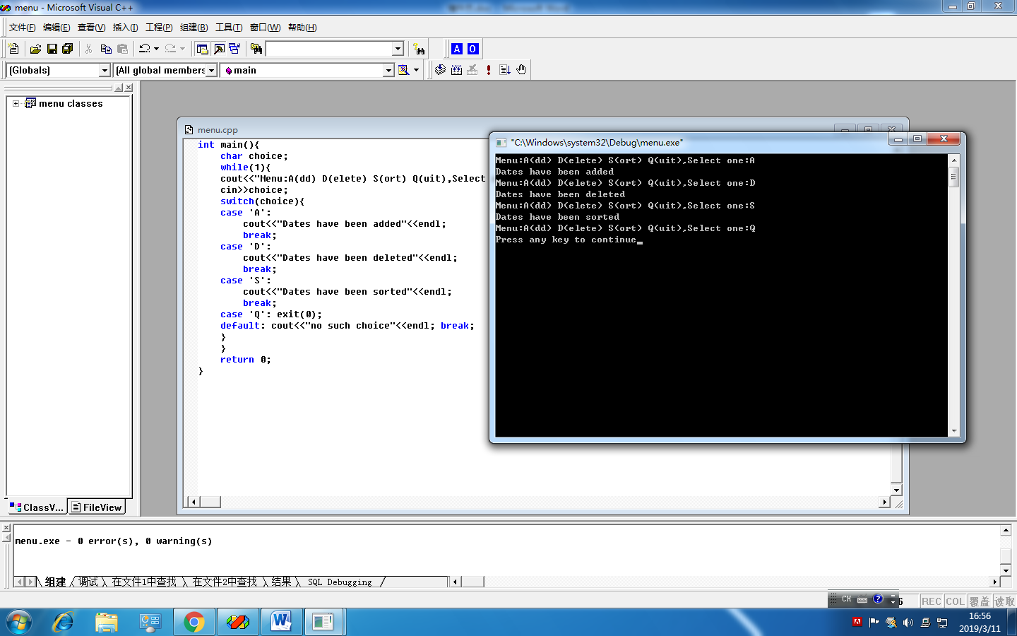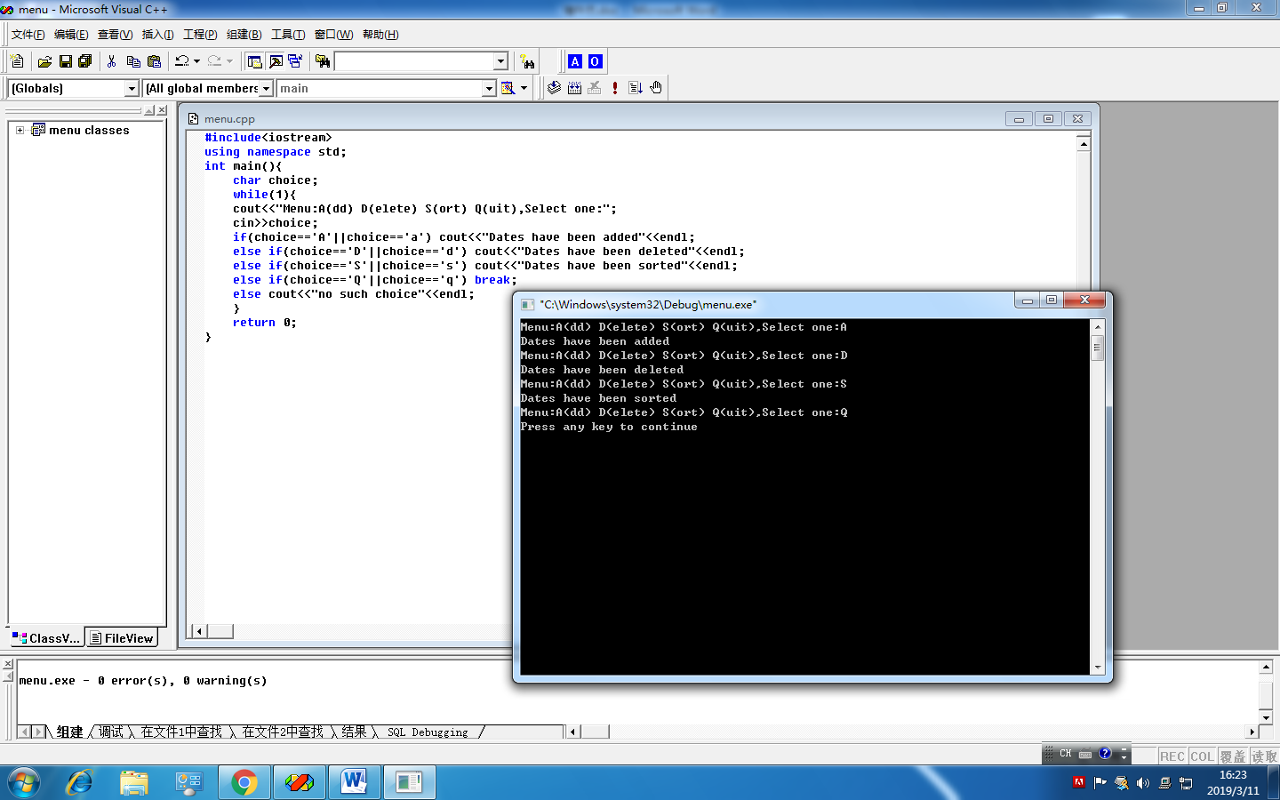 cout<<"Menu:A(dd) D(elete) S(ort) Q(uit),Select one:";