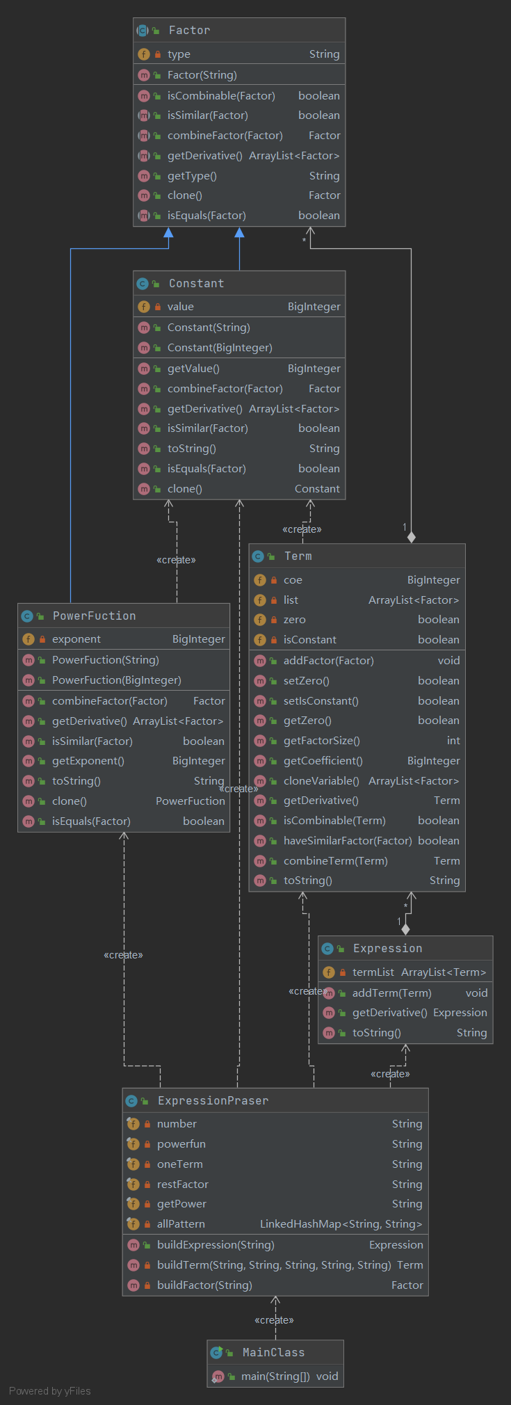 - Expression(表达式):因为表达式因子的存在,所以也视为抽象类Factor的子类。同时存储方式改为HashMap,并增加优化simplifyAmongTerm——若表达式内的项只有一个表达式因子的一次方,就把它分解成若干项加入表达式中,以得到进一步的合并(就是连加中的拆括号)。