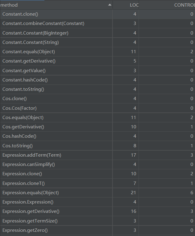 相比第一次作业,类的规模、方法的规模明显增多。其中规模较大的依然是Parser和Term.addPower(加因子并合并相同因子)。除了优化之外,因为视为不变对象,多处需要深克隆,也增加了方法的数量。