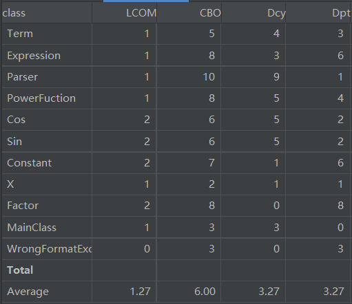 对于方法而言,可以看到由于因子变得复杂,有些方法的圈复杂度显著提高了。它们大部分是本来就比较复杂的因子解析(parseFactor)、支持嵌套因子的幂函数(PowerFunction)、和优化相关的(Term.addFactor)、以及有优化的toString。当然也包括一些新增的优化方法,其本身复杂度也比较高。但是平均值并不算有太大的提升,说明重构比较合理,实现了更多新功能而没有使程序控制过于复杂,也可以说明不同功能的模块之间低耦合。
