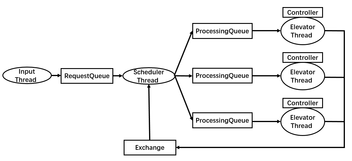 - 线程:InputThread、Schedule(全局调度器)、ElevatorThread、MainClass
