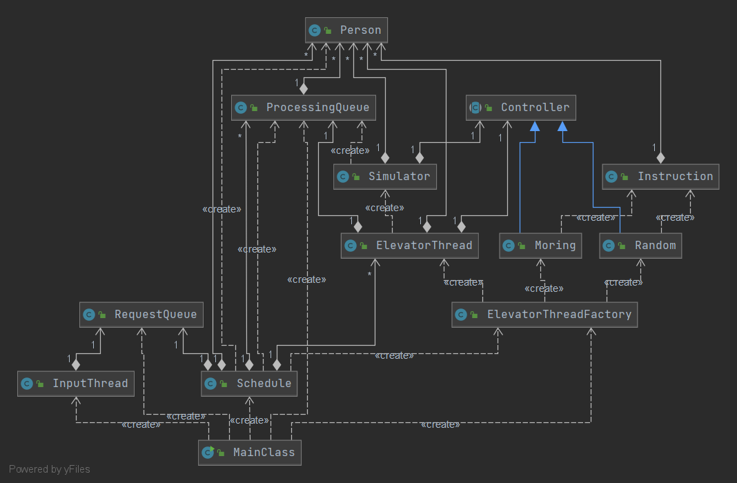 - 电梯相关:Controller(电梯策略,含子类)、Simulator(模拟电梯)、Instruction(电梯运行指令)、ElevatorThreadFactory(工厂)