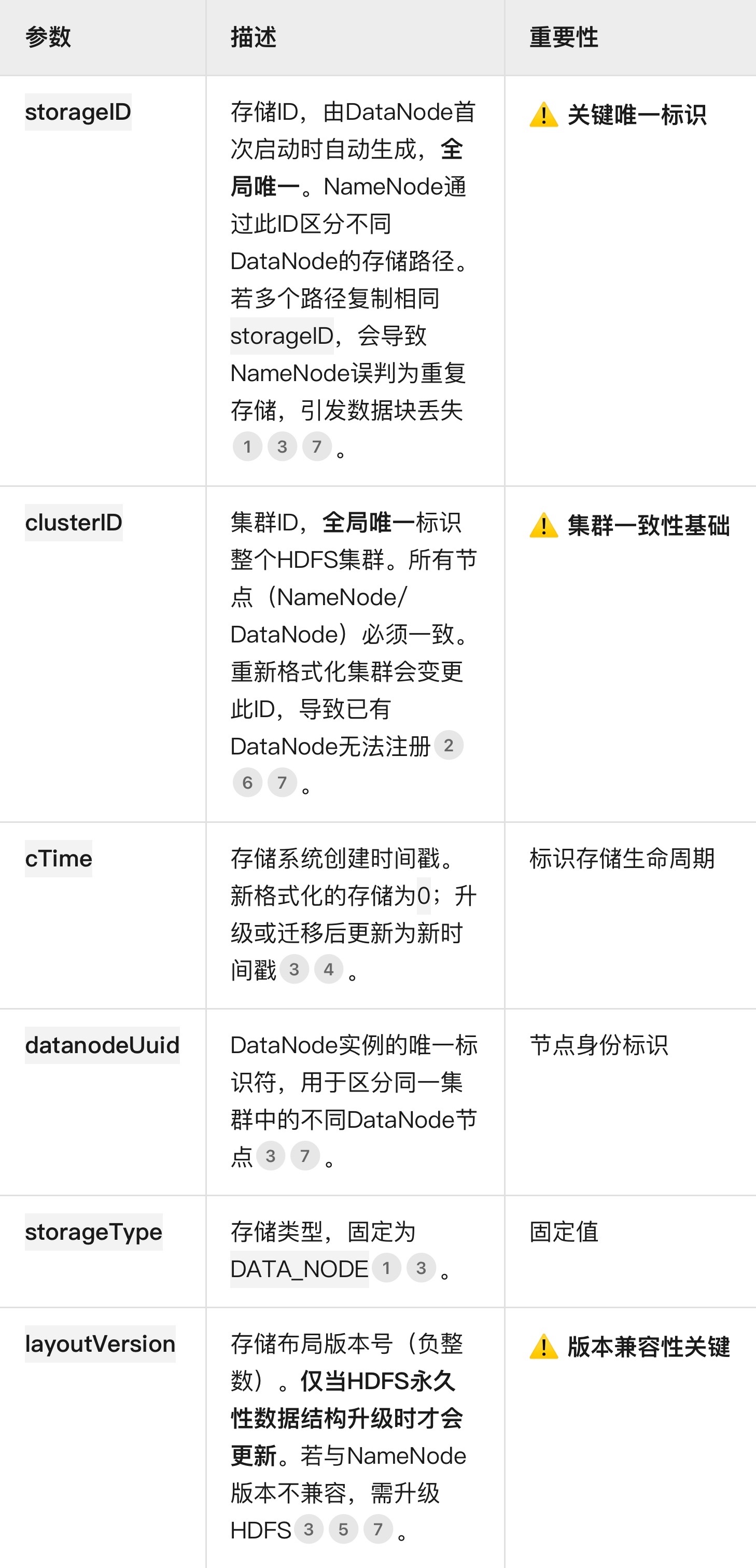 • HDFS每个数据目录的version文件包含唯一存储ID(StorageID)和集群ID(ClusterID)。从其他路径复制version文件会导致多个磁盘共享相同的存储ID。