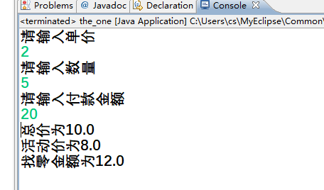 import java.util.Scanner;public class A {public static void main(String[] args) {//单价为d,数量为n,总价为sum,折后价为z,付款金额为f,找零为l. Scanner input=new Scanner(System.in); System.out.println("请输入单价");double d=input.nextDouble(); System.out.println("请输入数量");double n=input.nextDouble(); System.out.println("请输入付款金额");double f=input.nextDouble();double d,n,sum,z,f,l; sum=d*n; z=sum*.8; l=f-z; System.out.println("总价为"+sum); System.out.println("活动价为"+z); System.out.println("找零金额为"+l); } }