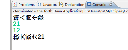 import java.util.Scanner;public class D {public static void main(String[] args) { Scanner input=new Scanner(System.in); System.out.println("输入两个数");int a=input.nextInt();int b=input.nextInt();int c=(a>b)?a:b; System.out.println("较大数为"+c); } }
