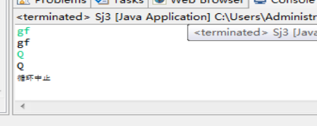 import java.util.Scanner; public class Sj3 { public static void main(String[] args){ Scanner input= new Scanner(System.in); for(;;){ String name = input.next(); System.out.println(name); if(name.equals("Q")){ System.out.println("循环中止"); break; } } } }