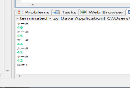 package zy; import java.util.Random; import java.util.Scanner; public class zy { public static void main(String[] args){ Scanner input=new Scanner(System.in); Random x=new Random(); int s=x.nextInt(100); for(;;){ int a=input.nextInt(); if(a==s){ System.out.println("猜对了"); break; }else if(a<s){ System.out.println("小一点"); }else if(a>s){ System.out.println("大一点"); } } } }