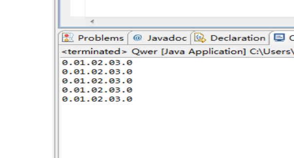package qwer; public class Qwer { public static void main(String[] args){ double[][] a = new double[5][4]; for (int i = 0; i < 5; i++) { for (int j = 0; j < 4; j++) { a[i][j] = j; } } for (int i = 0; i < 5; i++) { for (int j = 0; j < 4; j++) { System.out.print(a[i][j]); } System.out.println(); } } }