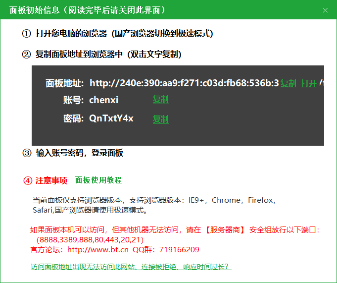 1.复制提示中的用户和密码,点击打开