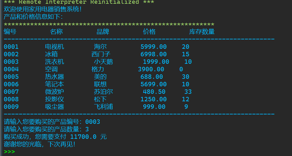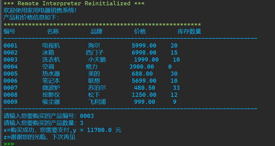 print('欢迎使用家用电器销售系统!')