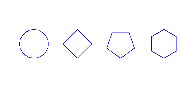 from turtle import * def moveto(x,y): penup() goto(x,y) pendown() def main(): pensize(2) pencolor('blue') moveto(-150,0) circle(50) moveto(0,0) circle(50,steps=4) moveto(150,0) circle(50,steps=5) moveto(300,0) circle(50,steps=6) hideturtle() done() main()