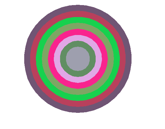 from turtle import * from random import random def moveto(x,y): penup() goto(x,y) pendown() def gen_color(): return tuple((random() for i in range(3))) def main(): setup(800,600) radius=180 offset=20 for i in range(8): moveto(0,-radius) color(gen_color()) begin_fill() circle(radius) end_fill() radius-=offset hideturtle() done() main()