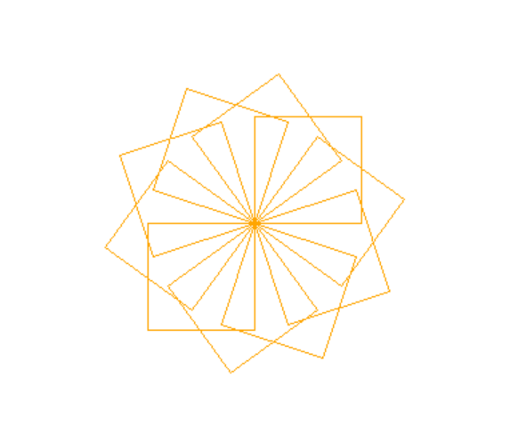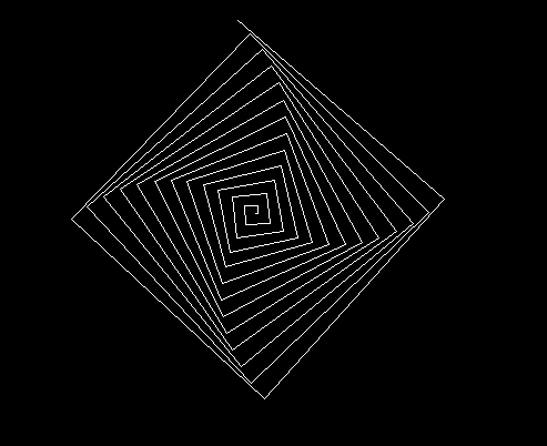 from turtle import * setup(800,600) bgcolor('black') pencolor('white') speed(0) angle=0 size=2 n=4 count=50 for i in range(count): fd(size) angle+=360/n+1 seth(angle) size+=5 hideturtle() done()