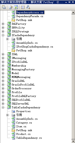 | 1.CacheDependencyFactory包: a.DependencyAccess.cs b.DependencyFacade.cs 2.ICacheDependency包 主要是IPetShopCacheDependency.cs 3.TableCacheDependency包: 每个model的缓存类以及基类:TableDependency.cs |