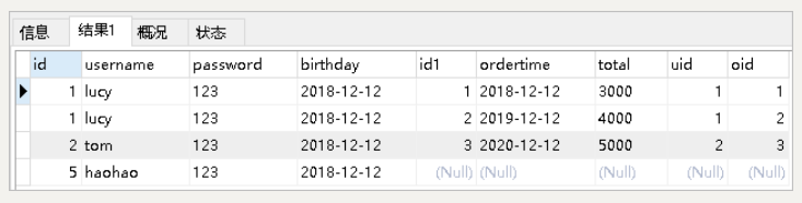 对应的sql语句:select *,o.id oid from user u left join orders o on u.id=o.uid;