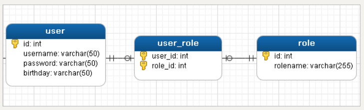 用户表和角色表的关系为,一个用户有多个角色,一个角色被多个用