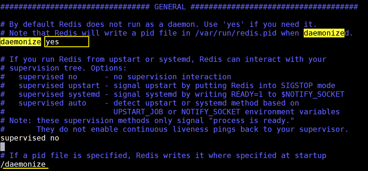 6.1 使用 / 搜索daemonize 修改no为yes,设置为后台启动,不再是霸屏启动