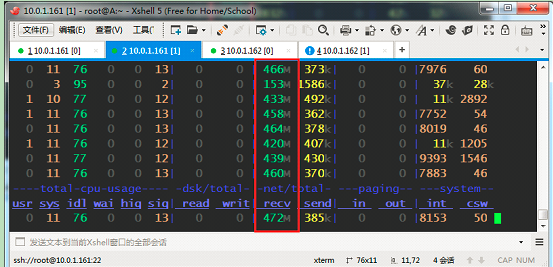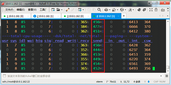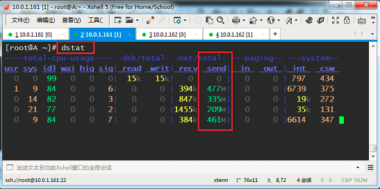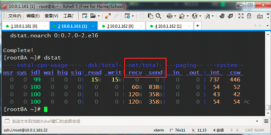 在复制的窗口上使用dstat命令查看当前网速,dstat命令比较直观,它可以查看当前cpu,磁盘,网络,内存页和系统的一些当前状态指标。