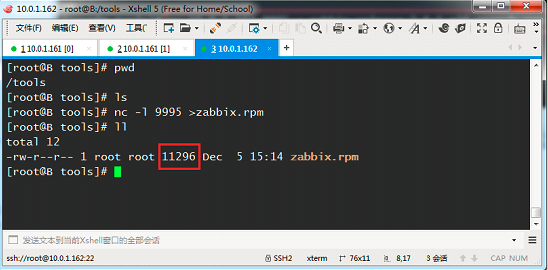 B机器接收完毕,它会自动退出监听,文件大小和A机器一样,md5值也一样