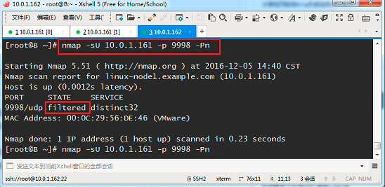注意:如果A机器开启了防火墙,扫描结果可能会是下面状态。(不能确定对方是否有监听9998端口)