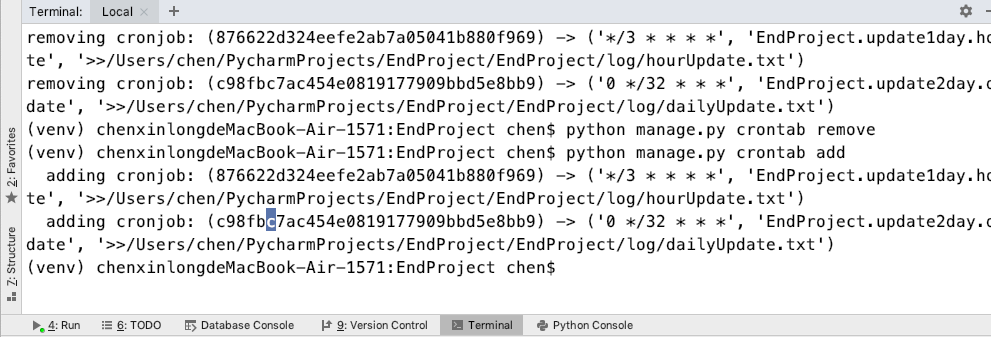 ('*/3 * * * *', 'EndProject.update1day.hourUpdate','>>/Users/chen/PycharmProjects/EndProject/EndProject/log/hourUpdate.txt'),