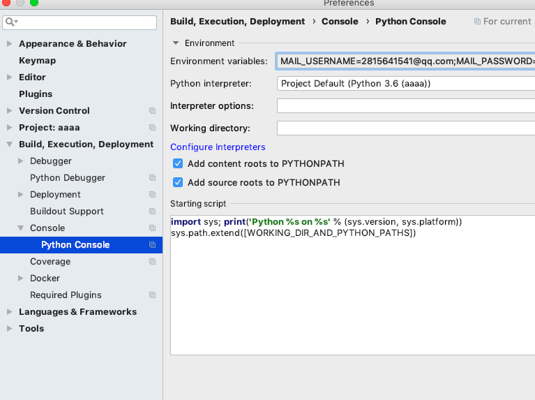1. Preference -> Build, Execution, Deployment -> Console -> Python Console 下最上面可设置环境变量