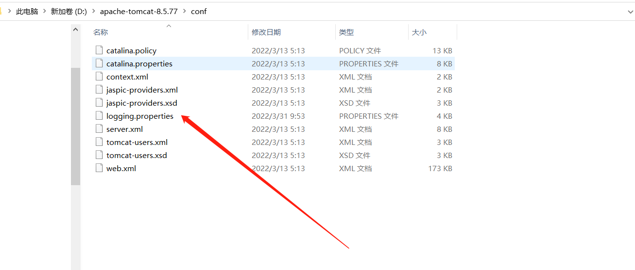 第一步:打开Tomcat安装位置,找到:conf下的logging.properties文件,然后右击使用文本编辑器打开。