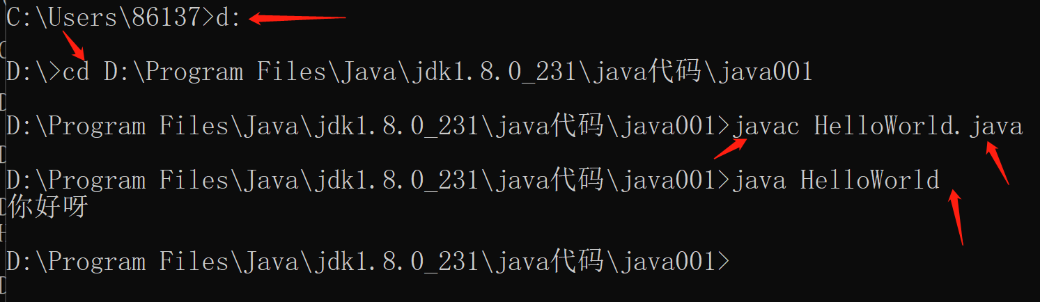 然后输入 javac HelloWorld.java(其实只需要输入一个H,按tab即可,将class改成java)回车
