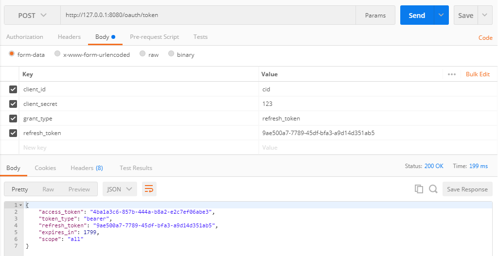 // 另外可访问 http://127.0.0.1:8080/oauth/token [POST] 刷新 token