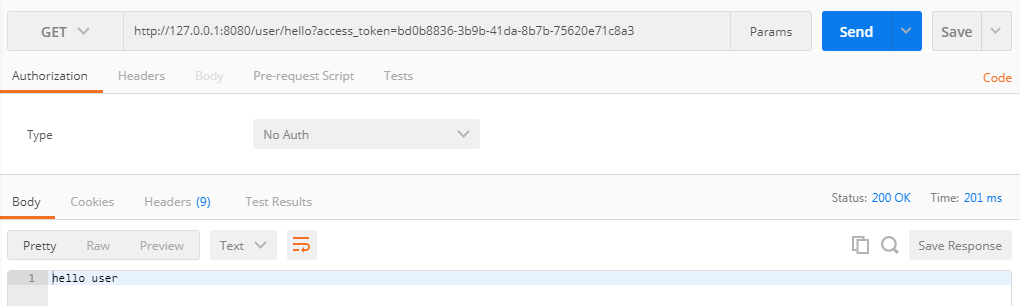 // 2.再根据上面获取的 access_token 访问实际的请求 http://127.0.0.1:8080/user/hello?access_token=bd0b8836-3b9b-41da-8b7b-75620e71c8a3 [GET]