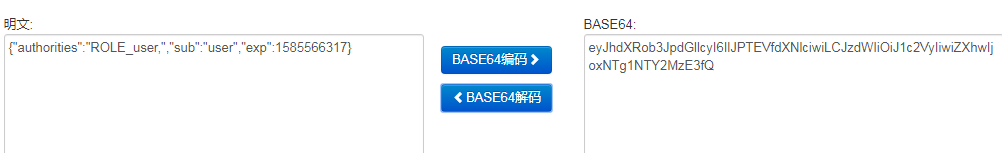 // 2.Payload:载荷,就是有效数据,采用 Base64 编码,如:eyJhdXRob3JpdGllcyI6IlJPTEVfdXNlciwiLCJzdWIiOiJ1c2VyIiwiZXhwIjoxNTc0NzczNTkyfQ