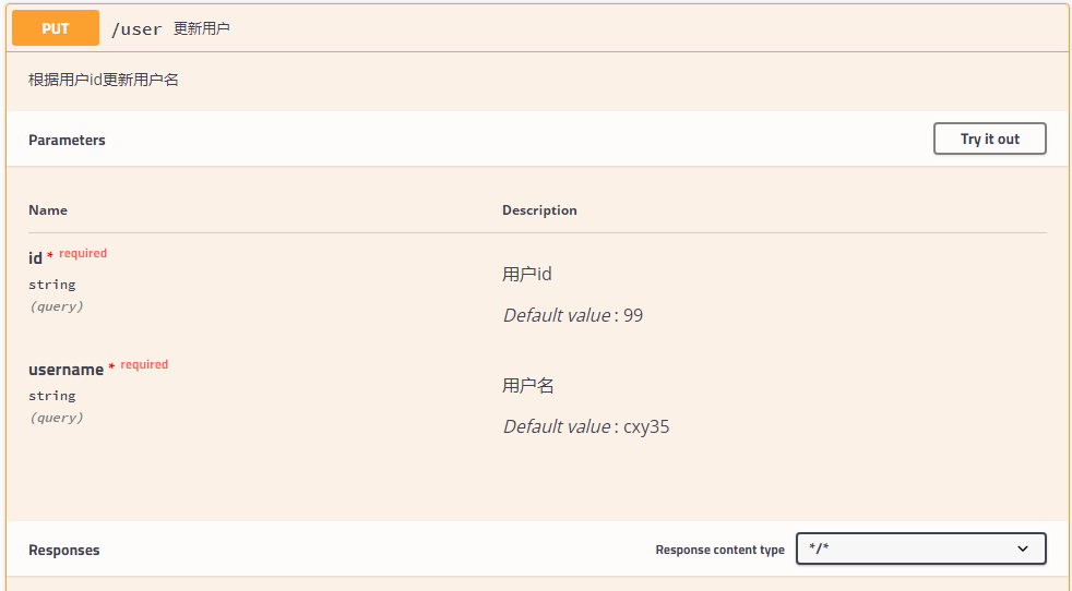 @ApiImplicitParam(name = "username", value = "用户名", required = true, defaultValue = "cxy35")
