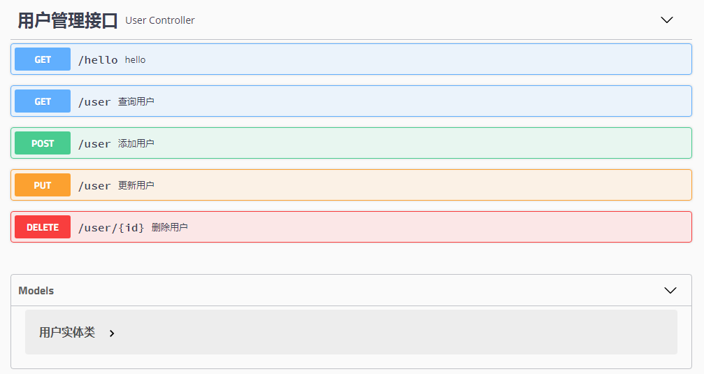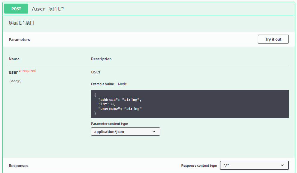 - 如果参数是一个对象(例如上文的 addUser 接口),对于参数的描述也可以放在实体类中,比如: