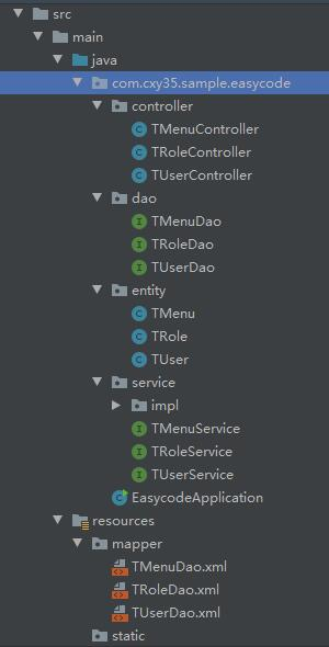 如果 controller/entity/service/dao 等包不存在会提示自动创建。最终生成的代码如下: