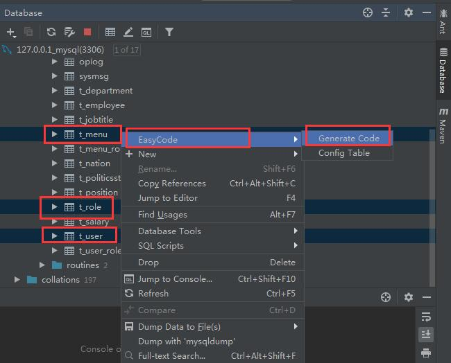选择对应的数据库和表(支持多张表同时生成),右键单击,选择 EasyCode -> Generate Code 。