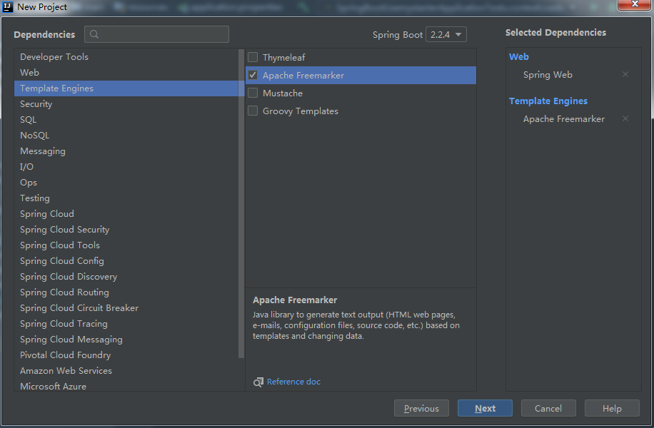 创建 Spring Boot 项目 spring-boot-freemarker ,增加 Web 和 Freemarker 依赖。